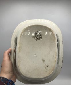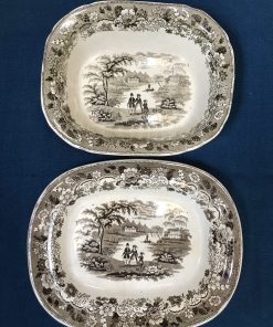 Alerte grosse pépite !!! Duo de plats Eton collège 1850. Voici un duo de choc !!! Cette vaisselle est très ancienne elle date en moyenne de 1860 à 1880. Le duo est composé d’un plat ovale, le fond est de couleur crème et dessus une magnifique illustration de paysage et d’une famille en balade, les dessins sont de couleur chocolat. Pour accompagner ce plat nous avons un plat creux de forme ovale également, l’un va avec l’autre. Il porte le mêmes décors que le premier. De vraies pièces antiques de collection, le premier plat porte un éclat en dessous (cf photos). Ils ne sont pas jeunes, ils portent les traces du temps avec une belle patine et quelques marques d’sure. Parfait pour les amoureux de vaisselle anciennes, un gros coup de cœur pour ces deux là. Ils méritent de trôner à nouveau au centre de votre table et d’être les témoins de bons moments de joies et de partage. Offrez leur une seconde vie.
