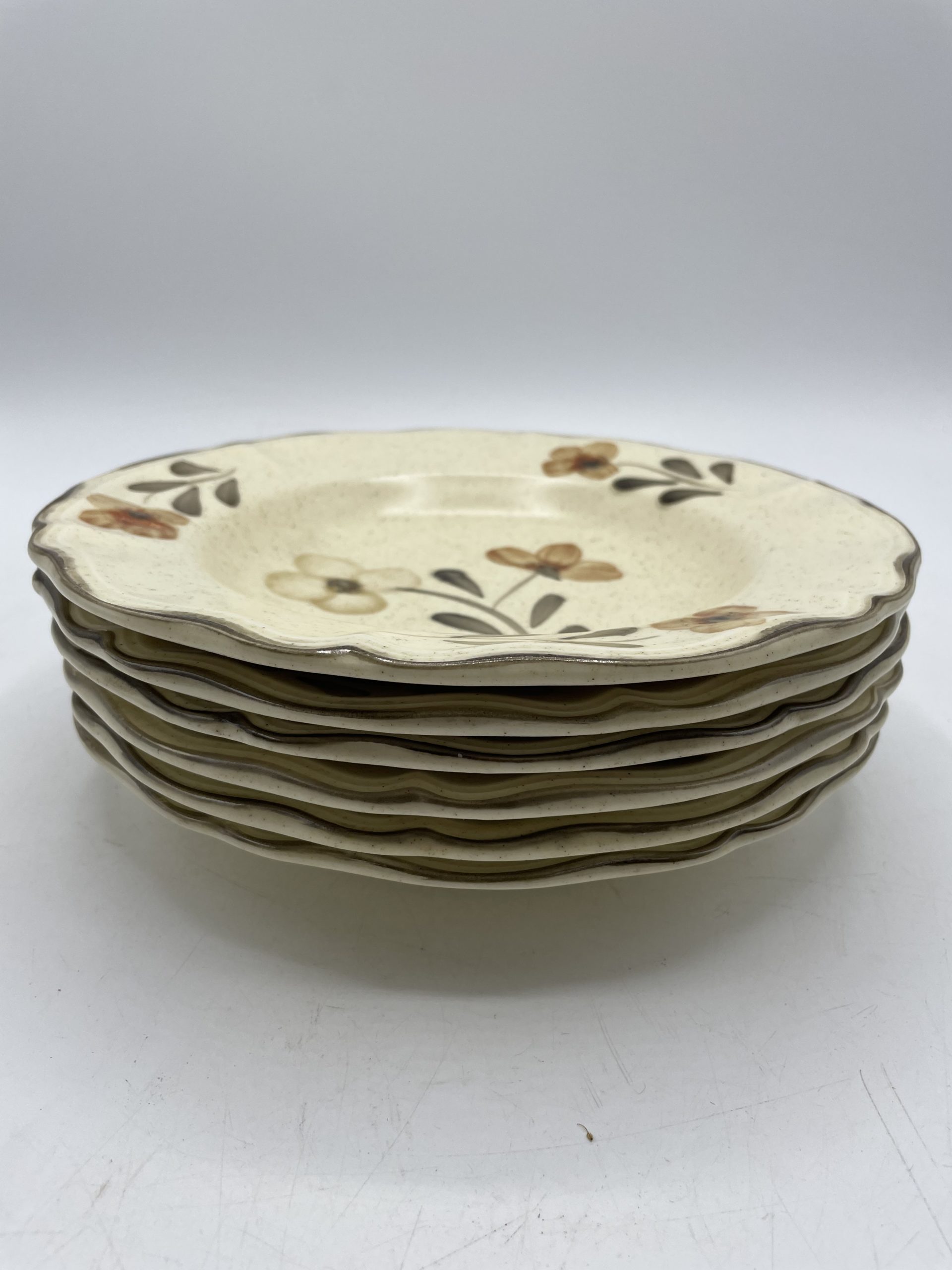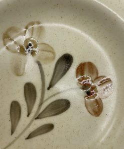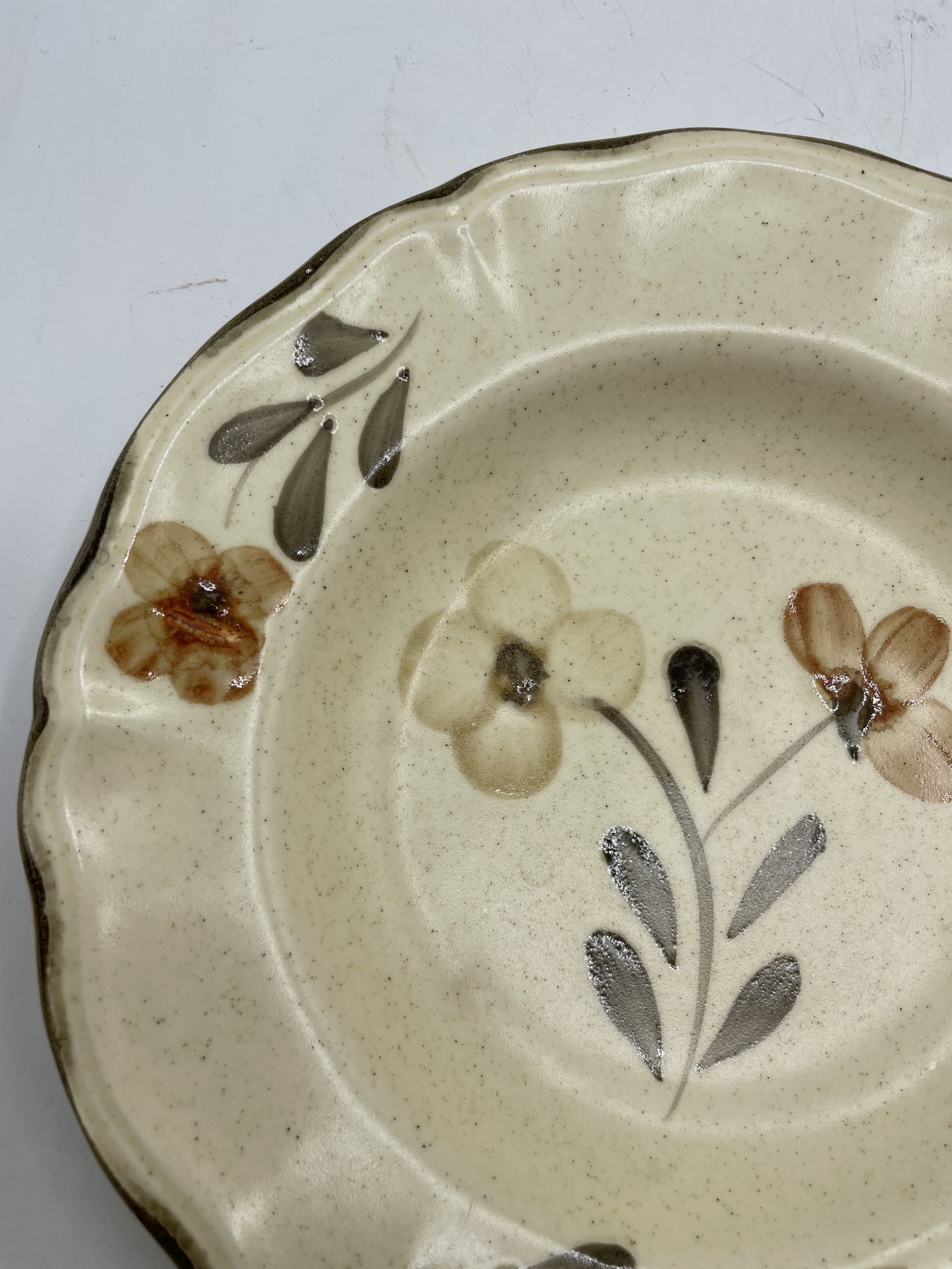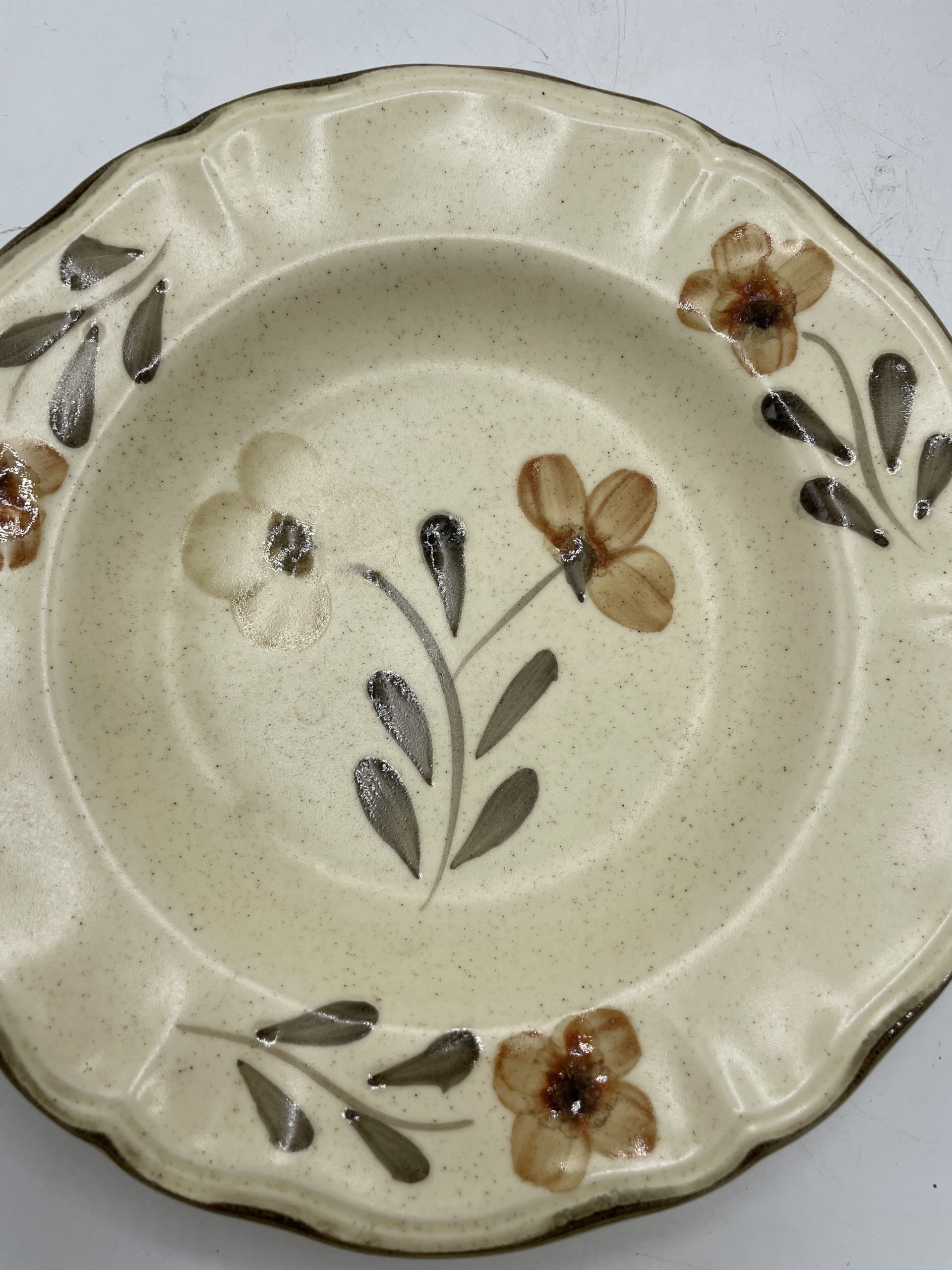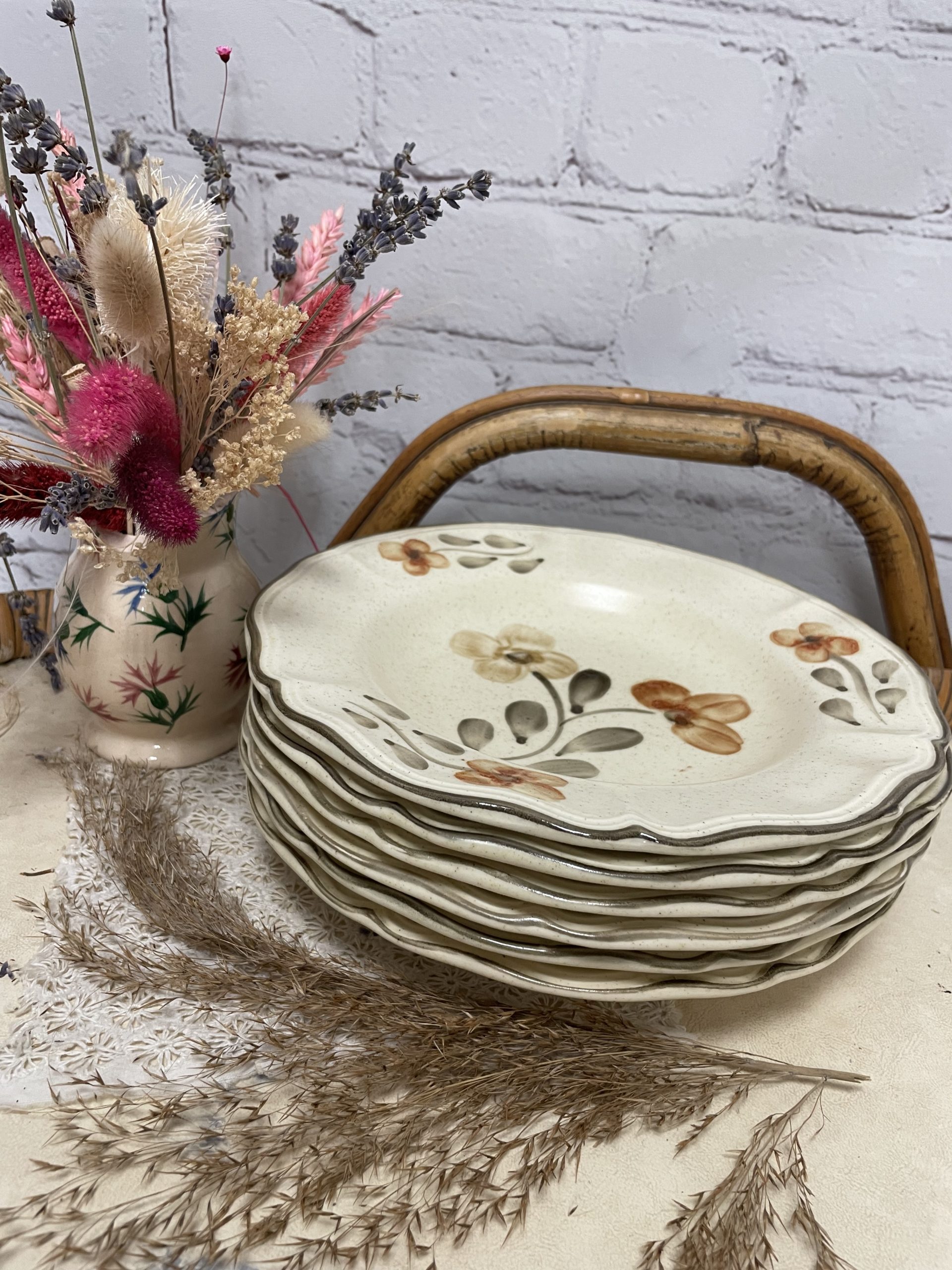 On adore ce joli lot de 6 assiettes vintage. Estampillées Sarreguemines Rivoli Atelier d’art, les assiettes sont de couleur beige tacheté et elles sont décorées de motifs de fleur de couleur brun, beige et noir et d’un fin liseré noir assorti. Vintage, de légères traces d’usure sont à prévoir (cf photos) jolies marques du temps passé. Avec leur jolie forme collerette, ces belles assiettes seront parfaites pour une table champêtre !